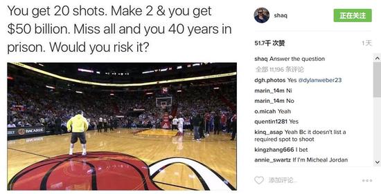 不过与此相关的并非只有勒布朗-詹姆斯,网友普遍讨论的还有另一个人,那就是“大鲨鱼”奥尼尔,此前他曾在自己的个人IG上晒图下注称“中圈投20个,进俩就给你500亿,一个不进就坐40年牢,你敢么?”
