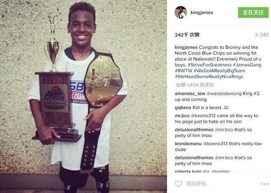 “祝贺布朗尼以及North Coast Blue Chips(勒布朗二世所在的篮球队)赢得全国比赛的第一名!特别为你们这帮男孩感到骄傲。#为伟大奋斗#詹姆斯军团#我们拥有一支很强的球队#我们需要一些很漂亮的戒指”詹姆斯在IG上写道,并且晒出了他的大儿子勒布朗二世手捧冠军奖杯和金腰带的照片。