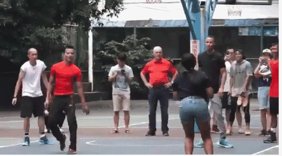 来到球场之后,库里与在场的学生们开展了一场“友谊赛”,令人颇感意外的是,库里的妻子阿耶莎也亲自上阵,而且他与库里亲自对位!