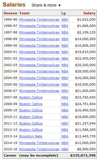 加内特生涯薪资总共3.4亿美元,位居所有美职篮职业球员第一。前五名分别是加内特:3.4亿美元;科比·布莱恩特:3.28亿美元;沙奎尔·奥尼尔:2.92亿美元;蒂姆·邓肯:2.35亿美元;德克·诺维茨基:2.28亿美元。目前来看,在新媒体合同的促进下,联盟中最有可能打破纪录的是克利夫兰骑士队的勒布朗·詹姆斯。