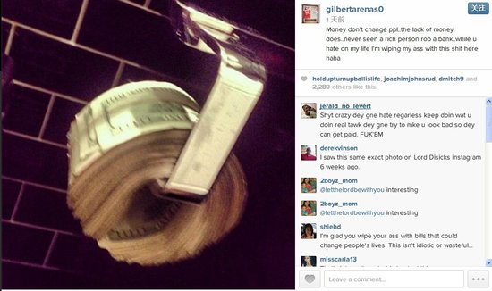 阿里纳斯还为图片配上了文字:“金钱不会改变一个人,不过要是没有钱,那就不一样了。在我们的生活中,我们永远都不会看到一个富有的人去抢劫银行。你可以讨厌和憎恨我过的生活,但是不要紧,因为当你们这样做的时候,我却在用这些“垃圾”来擦我的屁股。”