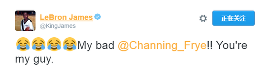 詹姆斯转发了这条推特,并向弗莱表达了歉意。他发了四个笑哭的表情并写道:“我的错,自己人!!”