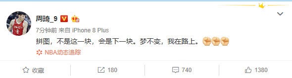 得知被火箭裁员后,周琦更新微博:“拼图,不是这一块,会是下一块。梦不变,我在路上。”