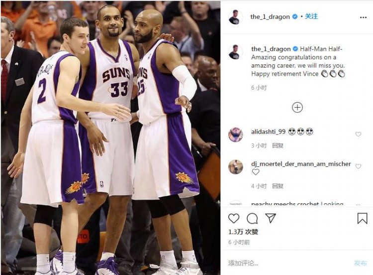“半人半神,祝贺你拥有如此出色的职业生涯,我们会想念你的。文斯,退役快乐!”