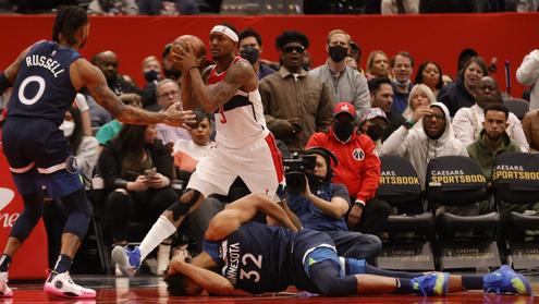 在森林狼输给奇才的最后一场比赛中,卡尔·安东尼·唐斯在肯塔维克斯·考德威尔·波普周围底线得分,扣篮过程中试图在篮筐上悬摆,失去了控制然后重重摔下,光是看着就很疼。
