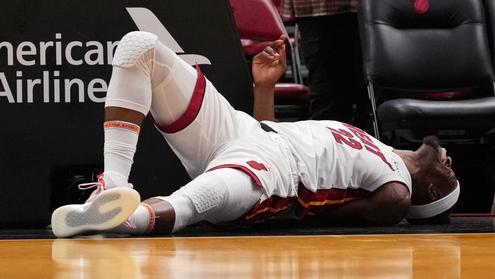 吉米-巴特勒因为尾骨受伤错过了四场比赛,但周一晚上他回到了对阵灰熊的比赛中。然后,在第一季度,又发生了意外。