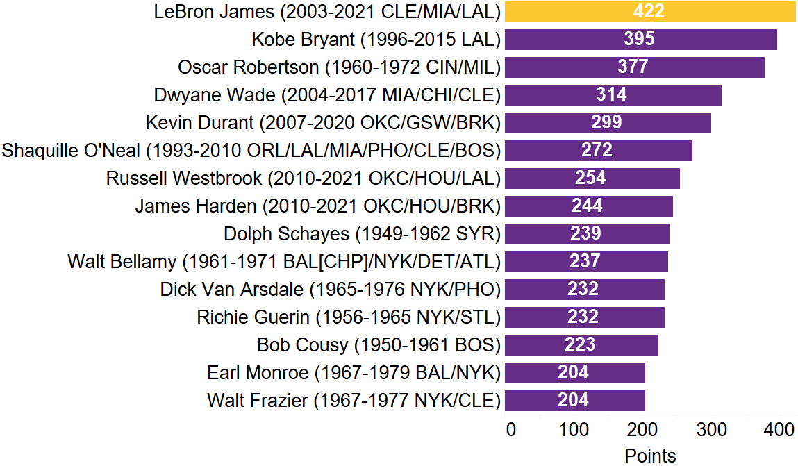 勒布朗(圣诞生涯最高的39分,9个篮板,7次助攻,3次抢断和1次盖帽)超过了科比·布莱恩特,成为了圣诞节得分最多的球员: