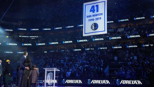 在德州,小牛队为了纪念诺维茨基,在比赛结束后举行了一场比NBA允许的中场时间长得多的球衣退役仪式。