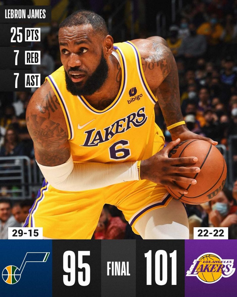 1月18日讯,2021-2022赛季NBA常规赛,湖人101-95战胜爵士。