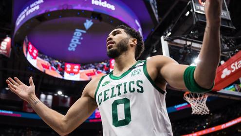 第三节还剩4分48秒时,塔图姆凭借两记罚球得分40分。过了一会儿,他的一个扣篮将他的赛季最高记录——上个月对阵密尔沃基时的42个扣篮——追平了。在本节结束前,他又投进两记三分,其中一记三分帮助波士顿以89-62领先。