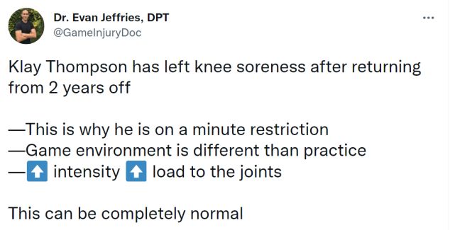 两大医学专家也就汤普森的膝盖酸痛问题进行解析。医学专家Evan Jeffries写道:“在缺阵两年后,汤普森回归后出现左膝酸痛的现象。这就是为什么他需要有上场时间限制的原因。比赛的环境毕竟和训练不一样,强升,也会作用于关节。这是完全正常的反应。”