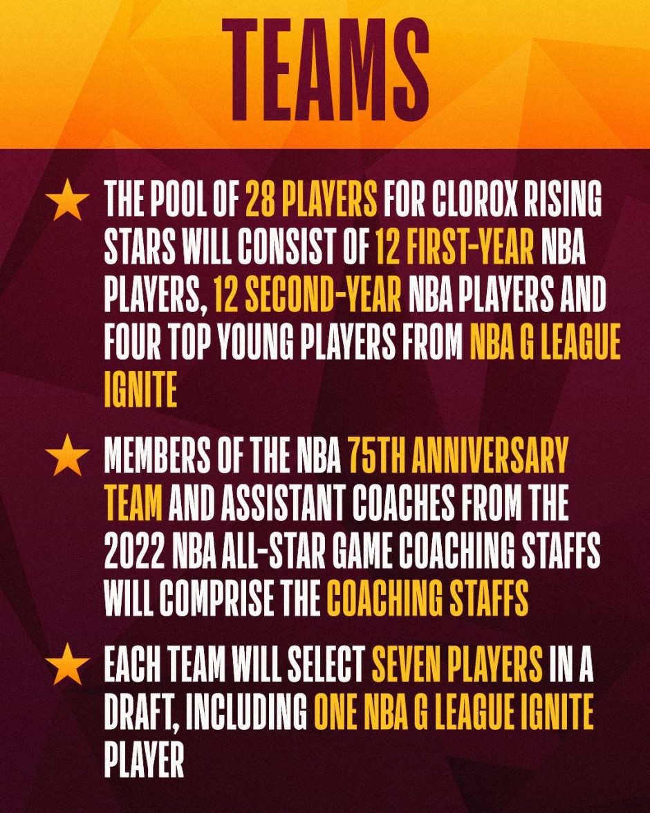 本届的新秀赛将分成四支球队,每支球队七个人,这二十八名球员来自12位新秀,12位二年级生以及4名发展联盟点燃队的球员。他们将分成两组进行半决赛,一共打25分,胜者将进入决赛,决赛也将是以25分为终点,三场合计75分,致敬NBA75周年。