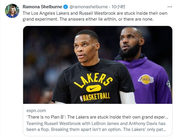 名记Ramona Shelburne在ESPN上发表了一篇文章分享了她知道的内幕,在湖人内部对于威少展开了非常激烈的争论,管理层并非铁板一块,但他们都认可一件事,那就是他们没有B计划了。