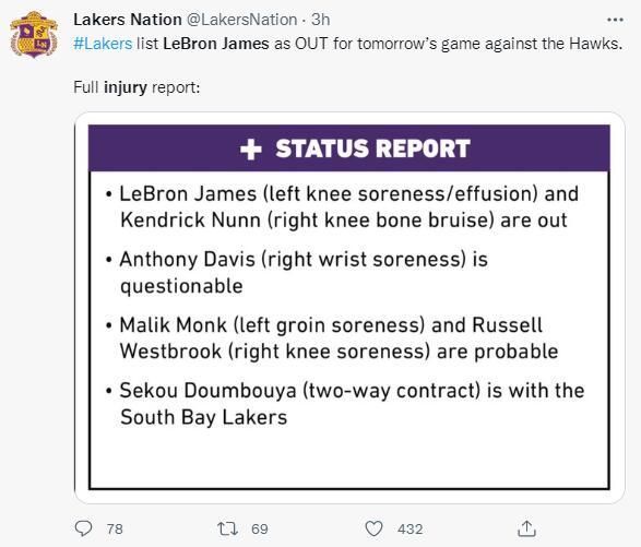 本文湖人发布对阵老鹰伤病名单 詹姆斯继续缺席 浓眉出战成疑是由球赛吧通过来源:外网翻译更新,更多篮球新闻尽在www.qiusaiba.com