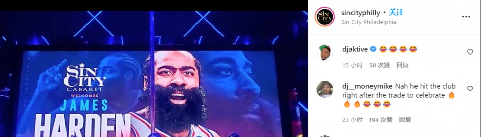 在交易正式完成后,哈登正式降临费城,当地脱衣舞俱乐部Sincity Philly在ins社交平台发动态欢迎哈登,并且在舞台背景上放出哈登海报,舞台中间还带有一个美女。