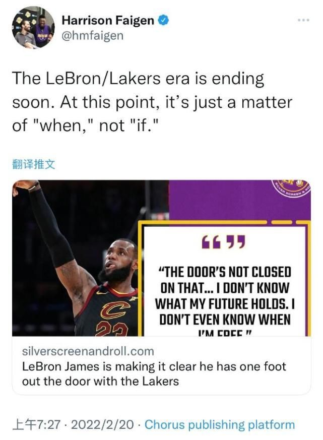 湖人当地媒体直接用了勒布朗表示他已经一只脚迈出了湖人的标题,随后湖人记者哈里森-费根转发评论:LBJ离开湖人只是“时间问题”而不是“是否问题。”