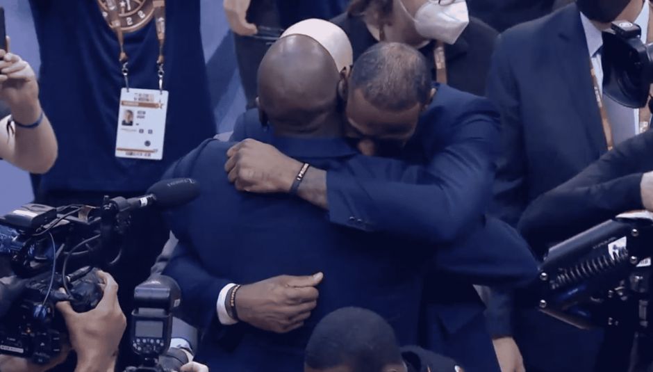 詹姆斯和乔丹在全明星赛中的75大球星颁奖典礼中相拥。