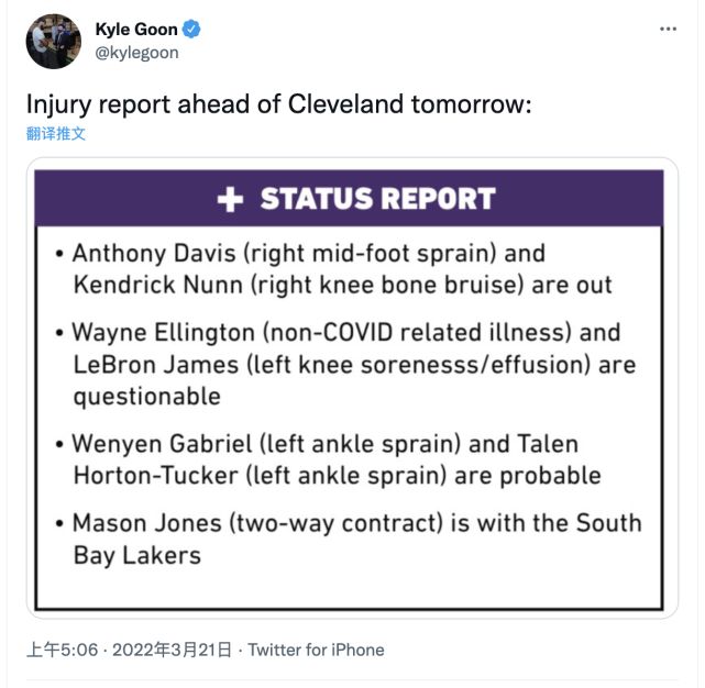 另一方面,湖人在下一场对阵骑士的比赛之前公布队内伤病名单: