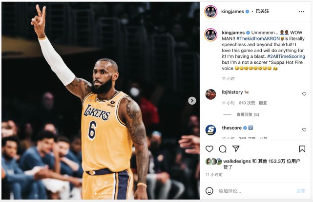 而在总得分超越名宿卡尔-马龙并且位居联盟第二位之后,詹姆斯也在社交媒体上谈及这一荣誉: