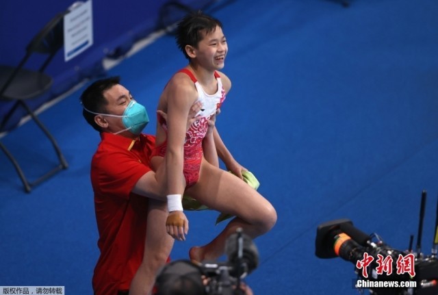 全红婵摘得金牌,赛后教练把她高高举起。