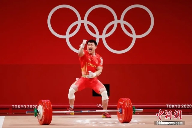 东京奥运会男子举重67公斤级比赛中,中国选手谌利军以抓举145公斤、挺举187公斤、总成绩332公斤夺冠。中新社记者 韩海丹 摄
